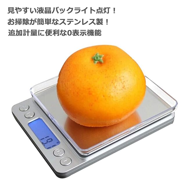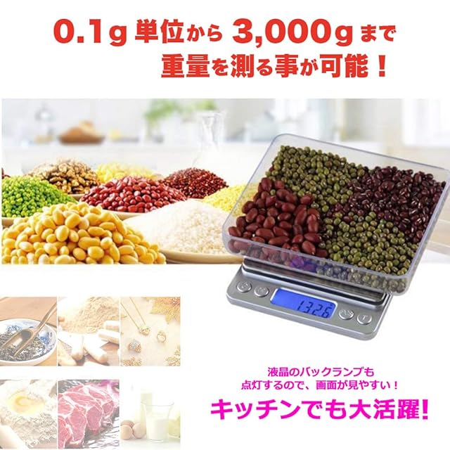 計量単位:0.1g 最大計量:3000g 最小計量:0.1g 電源:単4電池×2(テスト用電池付属)