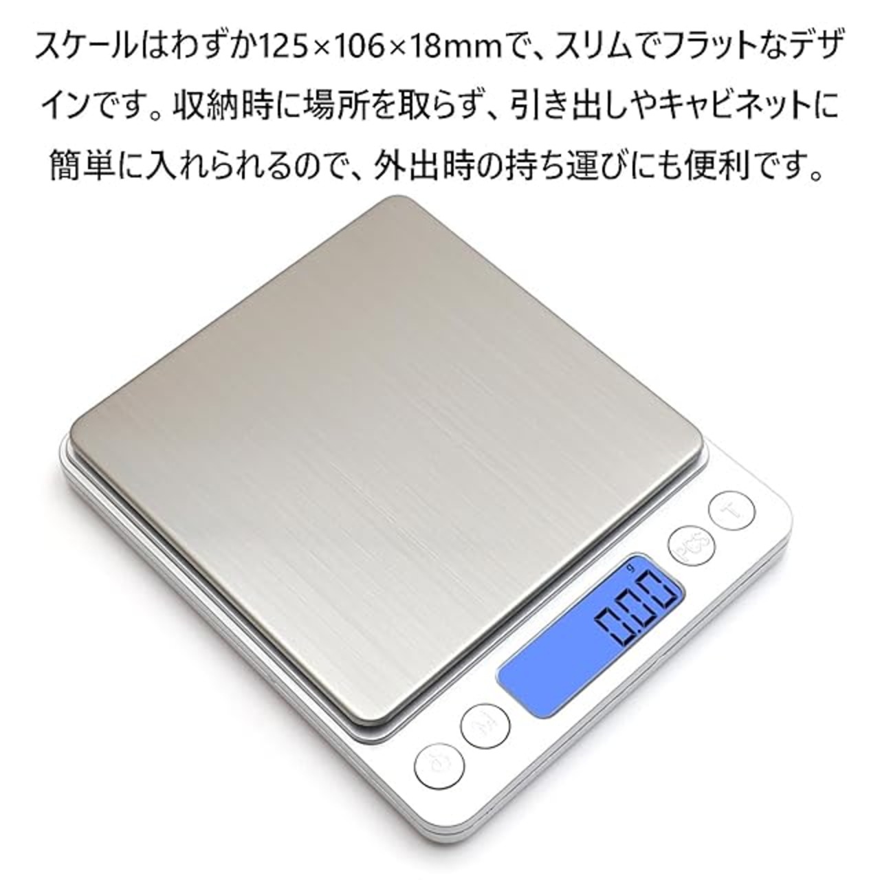 デジタルはかり デジタルスケール キッチンスケール クッキングスケール 0.1g単位 キッチン クッキング はかり 0.5gから3kgまで 精密電子はかり 計量器 測り 料理 調理 お菓子作り コンパクト 風袋引き機能 オートオフ機能 バッテリ付き トレー2個付き シルバー