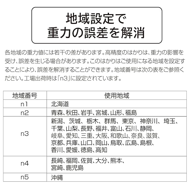 ● 地域設定で重力の誤差を解消● 追加材料のみの計量や容器の重さの差し引き計量ができる0表示機能付き● オートパワーオフ(電源切り忘れ防止)機能付きの省エネ設計