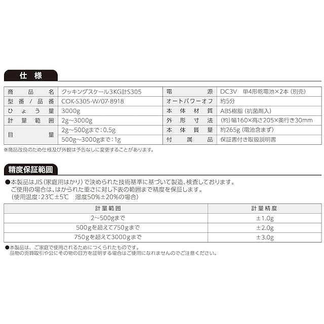 【 仕 様 】■ ひょう量:3000g■ 計量範囲:2g~3000g■ 目量:2g~500gまで 0.5g、500g~3000gまで 1g■ 電源:DC3V 単4形乾電池×2本(別売)■ オートパワーオフ:約5分