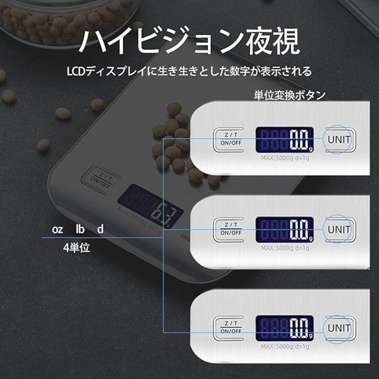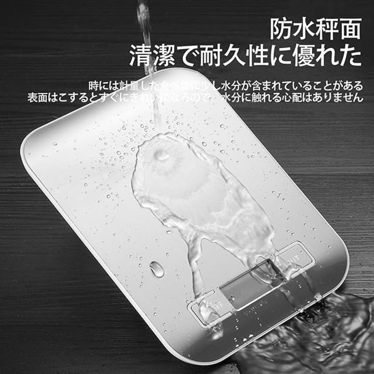 【高精度&広範囲計量】 このデジタルはかりは最小単位は1gからで測定範囲は最大5kgまで対応します。健康管理のための食事量の正確な計測に特に便利で、コーヒー、ペットの餌、郵便物など様々なアイテムの重量を測定でき、幅広い用途に利用できる計量器です。<br><br><br>【大面積で薄型軽量】大きい積載面積で、より多くの計量物が乗せられ、効率よく測定できますとともに、小型で軽量、収納や持ち運びはラクラク。バックライト付きの全視角大画面を搭載,横から見ても表示がはっきり見えます。<br><br><br>【LCD大画面表示】 見やすいLCDフルディスプレイを搭載して、夜間でもしっかりと見えます。また、シンプル且つ大きいなボタンで、操作がもっとやすくて、子供や老人にはとても便利です。<br><br><br>【ステンレス表面】デジタルスケールの表面が高品質のステンレスを採用し、防錆や耐久性がもちろん、汚してしまった場合は、サッと拭くだけですぐ綺麗になります。背面には滑り止め付き、安定性に優れています。<br><br><br>【多機能キッチンスケール】 風袋引き機能、自動校正、バックライトなどの機能が揃えるデジタルスケールです。お菓子やパン作り、調合、郵便物、動物の餌などの計測、幅広くお使いいただけます。<br><br><br>