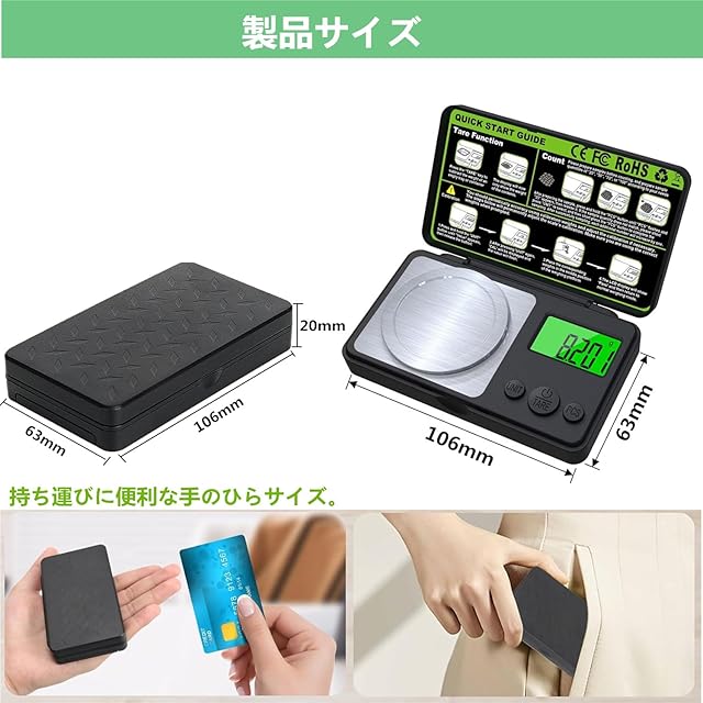 【安心&パッケージ内容】お買上日より1年間のメーカー期間がついております。アフターサービスが必要な場合、お気軽に弊社まで連絡ください。連絡方法:「アカウントサービス」→「注文履歴」→「販売元」→「質問する」。※はデジタルスケールx1、単4電池×2本、校正用の50g錘がx1、スモールカバーx1、日本語取扱説明書x1、ピンセットに加え。
