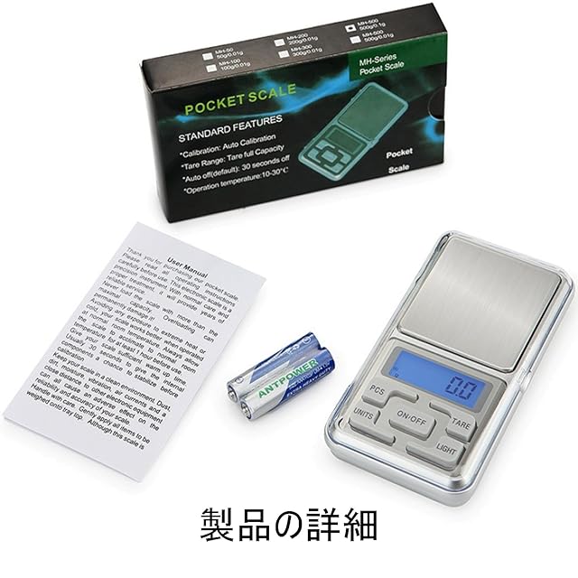 【機能】:本製品は計数、60秒後に自動的に電源を切る、バックライトスイッチ、LO _低電力表示、O _ Ld過負荷表示などの機能を有する。<br>【精密】:本製品は0.01gから500gの範囲の物品を秤量することができる。<br>【携帯性】:本製品は持ち運びに便利な小型電子秤です。開閉式の保護カバーが付いているので、屋外に持ち運んで使用してもスクリーンが傷つく心配はありません。バッグやポケットにも入れやすく、持ち運びにも便利です。<br>【付属品】:本製品には英語の取扱説明書及び(AAA 7号)乾電池×2が付属しています。<br>【アフターサービス】:商品に関する問題があれば、いつでも連絡してください。当社はタイムリーに処理しますので、安心して注文することができます。