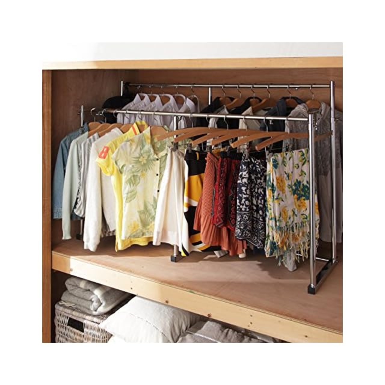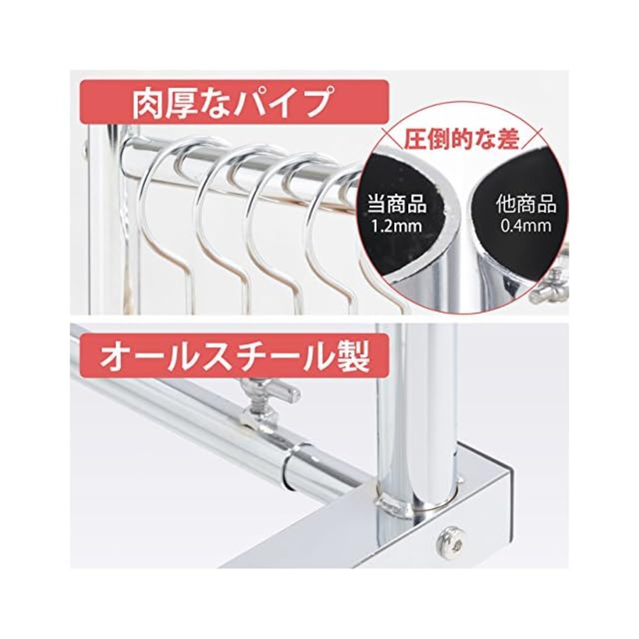 押入れ用の伸縮ハンガーラック1間。幅も高さも伸縮するので、押入れにあわせてサイズ調節OK。厚みのある(1.2mm)スチールを使った頑丈なつくり。固定ネジなどの部品もスチール製なので、使っているうちに接合部分が緩みグラグラして壊れたりする心配もありません。