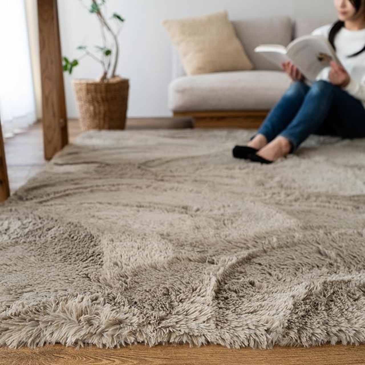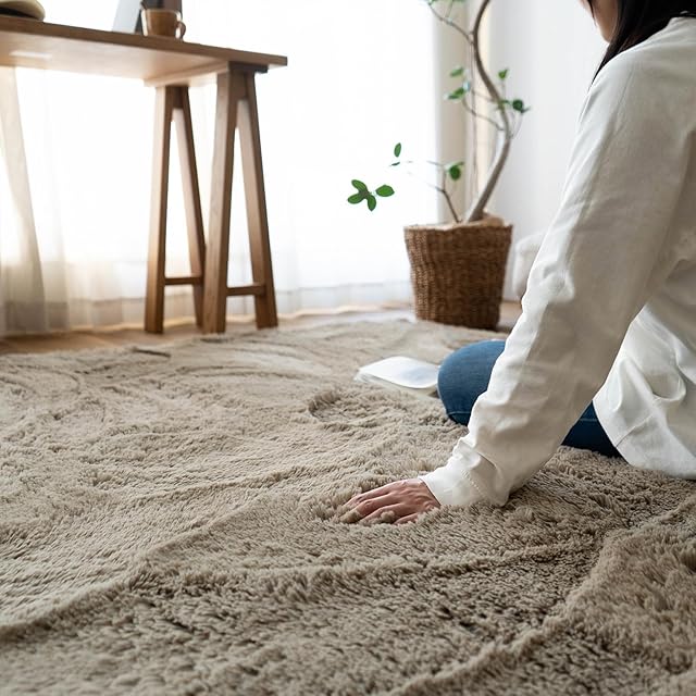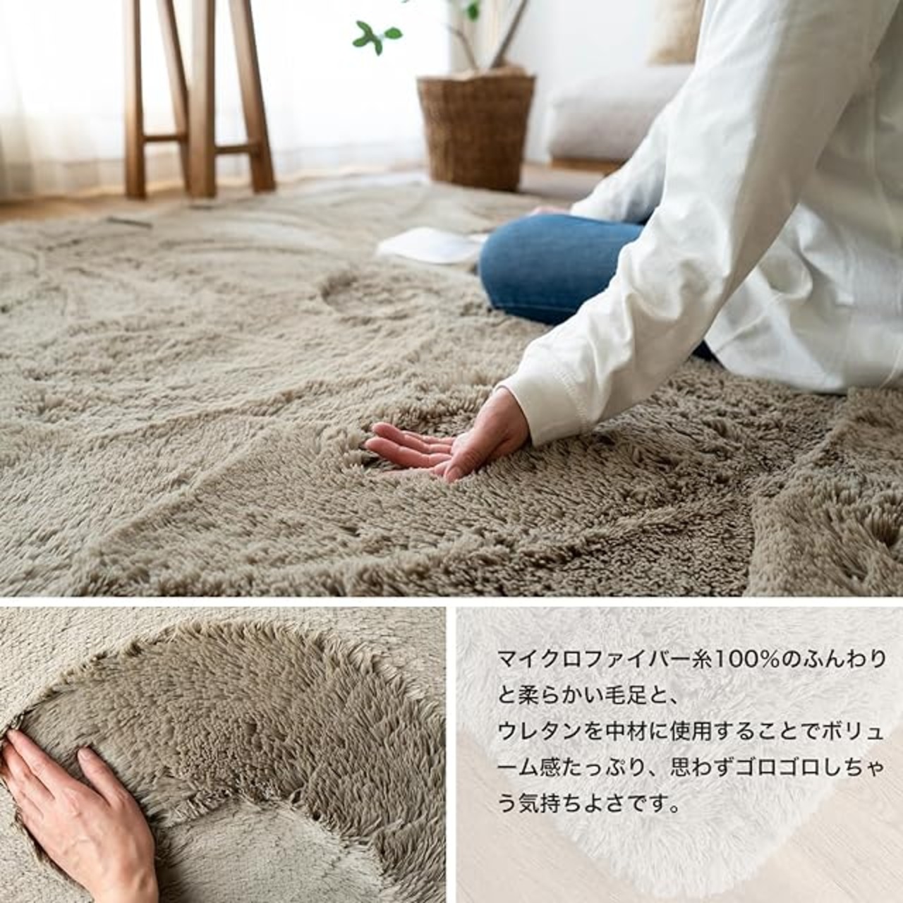 お色の風合いがやさしく、肌触り、足触り、気持ち良い、マイクロファイバー繊維のシャギーラグです。お洗濯が出来て衛生的で、カーペット下のお掃除や、移動の際には、折りたたんで、ご利用頂けます。 使用される マイクロファイバー繊維 の特徴。 1ミリ単位よりも、細いマイクロ単位の極細繊維です。… 1ミリ=1045マイクロ。 特徴 ● 断面で見ると多角形の形状繊維のため、細かいチリなどを取り込む性質をもちます。 ● 吸湿性。 ● 通気性。 ● 保温性。 ● 速乾性。 ● 保温性。 使用される ポリエステル の特徴。 ● カビに侵されにくく、虫に対する抵抗性を持つ。 ● 他の繊維と比べ、汚れにくい。 ● こすれて、損耗しにくい、耐磨耗性。