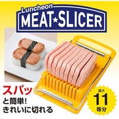 ▼使い方 : ランチョンミートスライサーの上にランチョンミートをのせます。約8mm間隔のステンレス製ワイヤーをおろすだけで、一度に最大11等分できます。 ランチョンミートはおむすびの他にも、サラダや炒め物など様々なお料理に使えます。