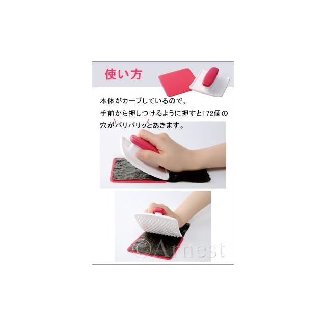 海苔が噛み切りにくかったり、喉に詰まったりなどのストレスを一気に解決してくれます。小さなお子様やお年寄りにオススメです。■size(約) 穴開け器/幅11×奥行10×高さ4cm シリコンシート/幅11×奥行11×厚み0.3cm■重量(約) 穴開け器/70g シリコンシート/35g■素材(耐熱温度) 穴開け器/ABS樹脂(80℃) シリコンシート/シリコーンゴム(200℃)■セット内容 穴開け器×1個、シリコンシート×1個made in China