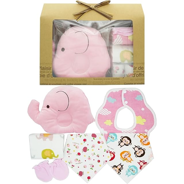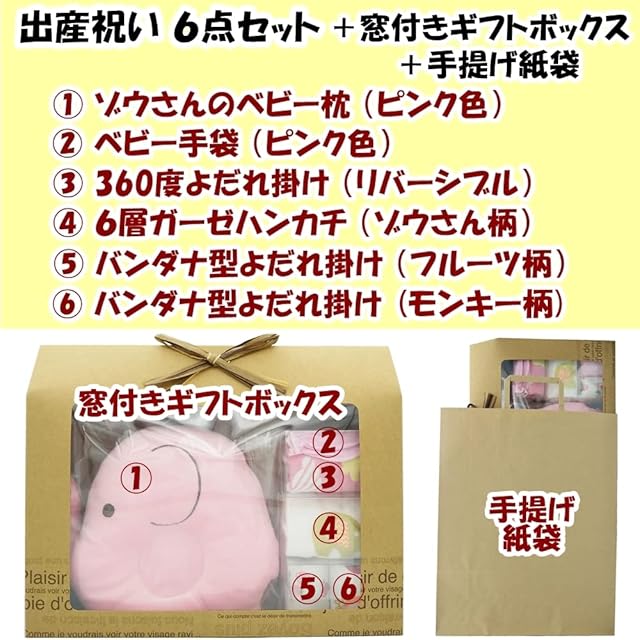 【出産ギフトセット内容】ゾウさんのベビー枕×1、ベビー手袋×1、360度よだれ掛け×1、6層ガーゼハンカチ×1、バンダナ型よだれ掛け×2、窓付きギフトボックス、手提げ紙袋