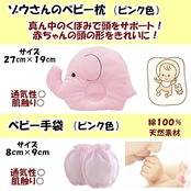 【商品説明1】ゾウさんのベビー枕は真ん中のくぼみで赤ちゃんの頭をサポートし頭の形をきれいに整えます。ベビー手袋は肌触り◎綿100%で通気性も良いです。360度よだれ掛けはコットン100%の6層ガーゼ素材で吸水性◎リバーシブルで表裏どちらもかわいいデザインです。