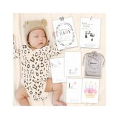 【セット内容】マンスリーカード30種15枚、手形足形台紙、命名書、リボンクリップ付クリアボード、透明保護フィルム15枚、三角スタンド付き、0~3歳の月齢フォトに対応。