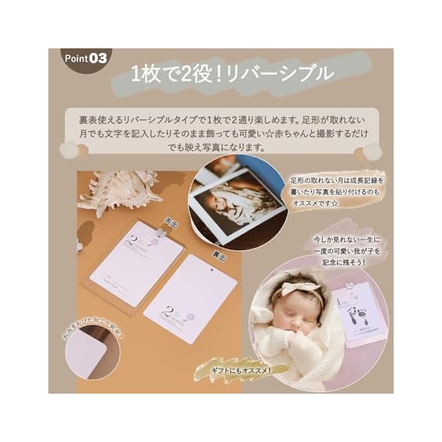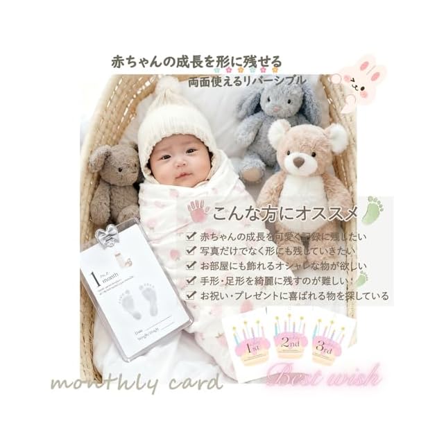 Amakaiのマンスリーカードは、赤ちゃんの0歳〜3歳までの成長を写真で残すための便利なアイテムです。 月齢フォトグッズ 手形 台紙 命名紙 手形 足形記録面とマンスリーカードとしての撮影面、どちらも使える2WAYデザイン。 リボンクリップ付きクリアボードがセットになっており、自宅で簡単に記念撮影ができます。 月齢カード 両面リバーシブルデザインで、シーンに合わせて使い分け可能。 安定感のあるスタンド付きなので、カードを立てて飾ったり撮影したりできます。 収納に便利なパッケージで、長期保管にも最適。 出産準備や出産祝い、誕生日ギフトにも喜ばれるかわいいベビーグッズです。