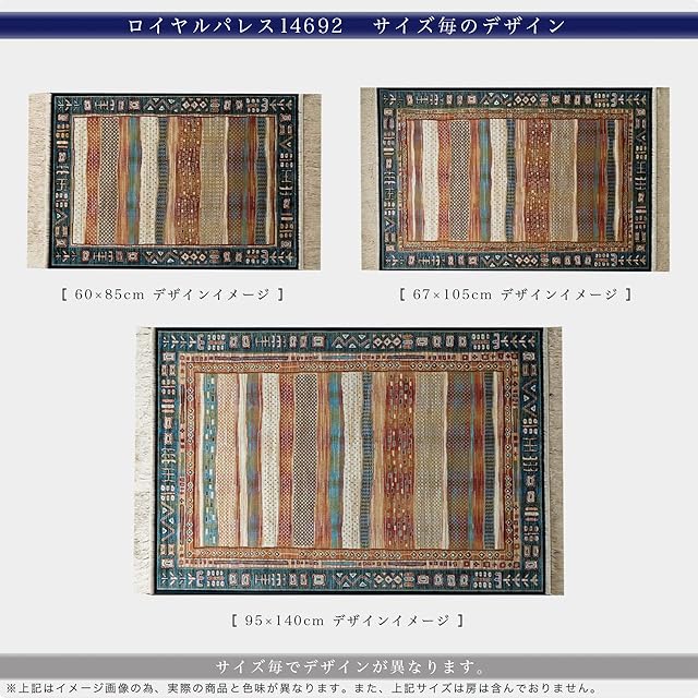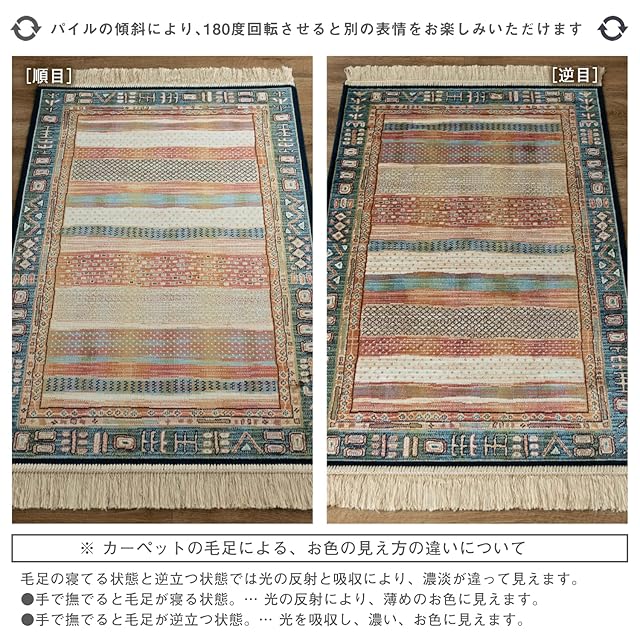 【輸入カーペットを安心してご利用いただくためのお願い】 ●輸入ラグに関して ※同じ商品でも製造ロットの違いによって、サイズや、色味、柄模様の左右が反転していたり、位置がズレている場合がございます。ただし、現地の工場や倉庫での検品をクリアした商品を輸入しています。あらかじめご了承くださいませ。/ ●においに関して ※ご使用当初、裏面に塗られる仕上げの接着塗料(ラテックス剤)のにおいがする場合がございます。人体への影響はありませんが、においに敏感の方や、ご心配の方はご理解の上ご購入お願いいたします。開封後常温のもとで気化(蒸発)するため、においはご使用につれてなくなります。気になる場合は風通しの良いところで陰干ししていただきますと、より早く解消されます。/ ●サイズに関して ※カーペットの製法上、表示サイズより0~3%の誤差がございます。/ ※いずれも商品の初期不良ではございませんので返品・交換は行なっておりません。(※お客様で返品のご負担によるキャンセルは、返品規定に基づきお受けさせていただきます。)/ ※裏面の製品シールは剥がさないでご使用ください。