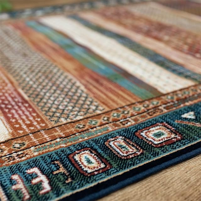 カラフルなギャベ柄の幾何学模様がポップな風合いのトライバルデザインです。 染色性が高く光沢性のあるレーヨンと肌触りのサラリとした綿を組み合わせで、肌触りやさしい、モケット織り薄型玄関マットです。 収納時や移動の際は、折りたたんでご利用頂けます。 使用される レーヨン の特徴。 ● 吸湿放湿性。 ● 光沢性。 ● 染色性。 ● 肌触りなめらか。 使用される綿の特徴。 ● 水分を吸収発散するため、サラサラとした肌触り。 ● 繊維の先端が丸いので、柔らかい肌ざわり。 ● 通気性が良い。 ●染色、発色性が良い。 モケット織りカーペットとは、 モケットとは、平らな表面に密度をもって、毛羽 ( カーペットでは、毛足。 ) を直立させた織物で、カーペットでは、薄型に仕上がります。 モケット織りにおける特性。 ● 肌触りが良い ● 光沢性 ● 耐久性 同様の織り方では、ポルトガル語のビロード、スペイン語のベルベット等があります。 ※ モケット織りカーペットをお選びになる際のお知らせ。 こちらの商品は仕上げの製法により、使用され、裏面に塗られるラテックスの接着塗料は、ご使用当初、常温のもとで気化( 蒸発 )する、揮発性の匂いがございます。