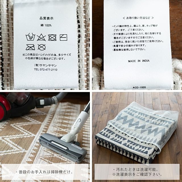 【備考】洗濯可(洗濯ネットをご使用ください、乾燥機は不可) / 折りたたみ可 / 床暖房の上敷き、ホットカーペットカバー対応 (※商品写真は140x200cmを使用しております。)/風合いにこだわる為、糸をミックスしてヴィンテージ感が出るようにしています。一点一点手作業で作る為に織りムラや歪みなどを感じることがあると思いますが、これもハンドメイドの味わいですので、ご理解くださいませ。/洗濯時に色落ちする場合がございますので、漂白剤及び漂白剤入りの洗剤のご使用は避け、他の物と分けて単独でお洗いください。洗濯で縮みますのでご注意ください。/完全に乾いた状態でご使用ください。/インド綿製品は色落ちしやすい特性があります。摩擦や水濡れ、汗によって色が移る可能性がございます。/インド綿の特性上、織りムラ、節、ネップ等ございますのでご了承の上、ご購入ください。