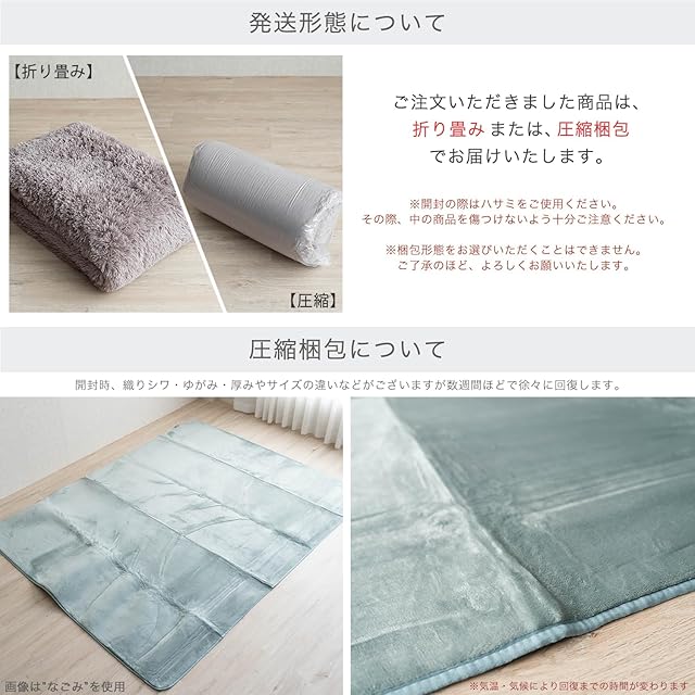 【備考】 丸洗い可能(洗濯ネットを使用し、手洗いコースをお選び下さい。洗濯機の取り扱い説明書をご確認の上、適した洗濯コースをお選びください。)洗濯後はすぐに形を整え日陰で干してください。乾燥機は使用できません。大きめサイズの洗濯に関しては、コインランドリー等をご使用ください。(190×190cm以上推奨)ご自宅の洗濯機容量が異なるため、お客様にてご確認ください。 / ※こちらの画像は 190x240cm を使用しております。 / 床暖房の上敷き、ホットカーペットカバー対応 。 / 圧縮梱包での配送となります。(圧縮時につくしわは、時間の経過とともに伸びてまいります。)
