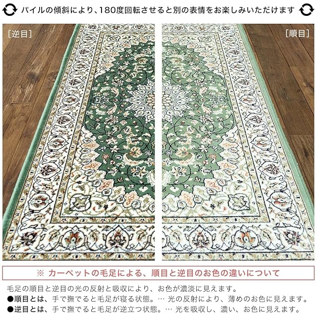 【輸入カーペットを安心してご利用いただくためのお願い】 ●輸入ラグに関して ※同じ商品でも製造ロットの違いによって、サイズや、色味、柄模様の左右が反転していたり、位置がズレている場合がございます。ただし、現地の工場や倉庫での検品をクリアした商品を輸入しています。あらかじめご了承くださいませ。/ ●においに関して ※ご使用当初、裏面に塗られる仕上げの接着塗料(ラテックス剤)のにおいがする場合がございます。人体への影響はありませんが、においに敏感の方や、ご心配の方はご理解の上ご購入お願いいたします。開封後常温のもとで気化(蒸発)するため、においはご使用につれてなくなります。気になる場合は風通しの良いところで陰干ししていただきますと、より早く解消されます。/ ●サイズに関して ※カーペットの製法上、表示サイズより0~3%の誤差がございます。/ ※いずれも商品の初期不良ではございませんので返品・交換は行なっておりません。(※お客様で返品のご負担によるキャンセルは、返品規定に基づきお受けさせていただきます。)/ ※裏面の製品シールは剥がさないでご使用ください。