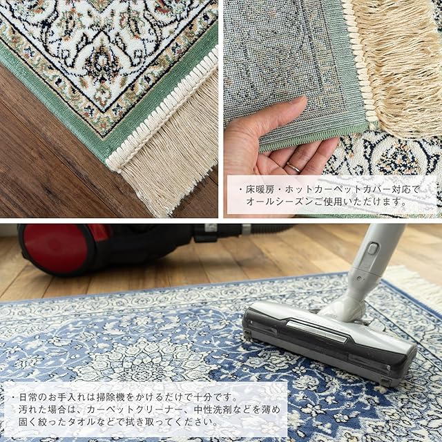 思わず見惚れる魅力的なアンティーク調のデザインラグです。さっとお部屋に敷くだけで、お洒落なお部屋を演出してくれます。カジュアルな家具と合わせたり、北欧風のシンプルな家具などに相性よくお楽しみいただけます。長年使い込まれたペルシャ絨毯のような風合いを、本場ベルギーの技術で、複数の色糸を使用し緻密にオールド絨毯の風合いを表現しています。レーヨンはアートシルクとも呼ばれており、シルク素材のような光沢感と風合いが特徴です。また綿素材を組み合わせ、肌触りもよく日常使いしやすい1枚です。厚みは約3ミリで軽くて扱いやすいのが特徴です。また毛足が短くゴミやホロリが入りにくいので掃除機もかけやすく、お手入れがしやすいラグです。床暖房&ホットカーペットカバー対応。