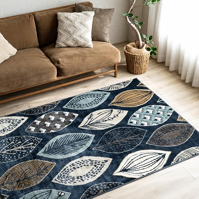 商品名:サヤンサヤン モダンリーフ2 リーフ柄 北欧風 ボタニカル ラグマット 100x150 1畳 ネイビー