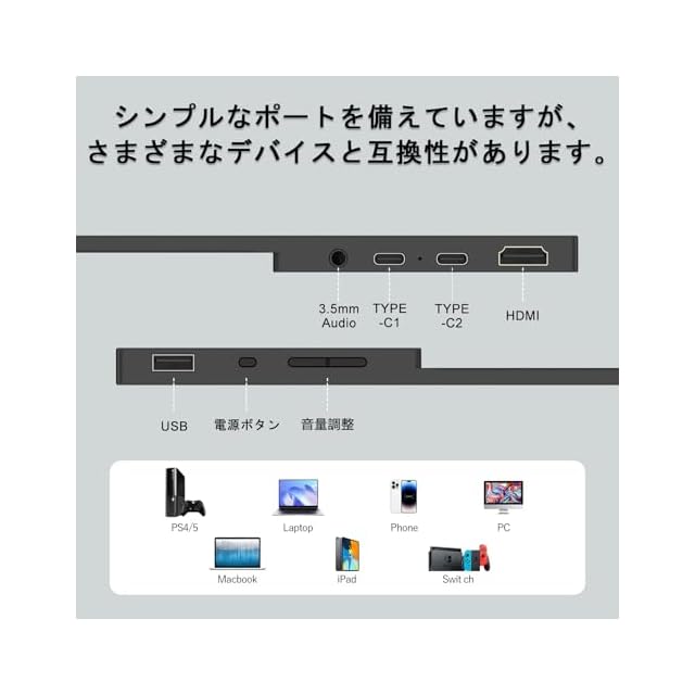 【接続は簡単です】デバイス側はフル機能のTYPE-C端子があれば、モバイルモニターに接続する時USB Type-Cケーブル1本で映像出力と電源供給が可能でございます。電話、ラップトップ、PC、Nintendo Switchゲーム機、PS3 / PS4 / PS5に簡単に接続できます。注意:コンピュータやスマートフォンから直接電源を取る場合、コンピュータの電源電圧の低下により、電源が不足して映像が表示できない場合があり、その場合は電源用のアダプタを使用する必要がある。