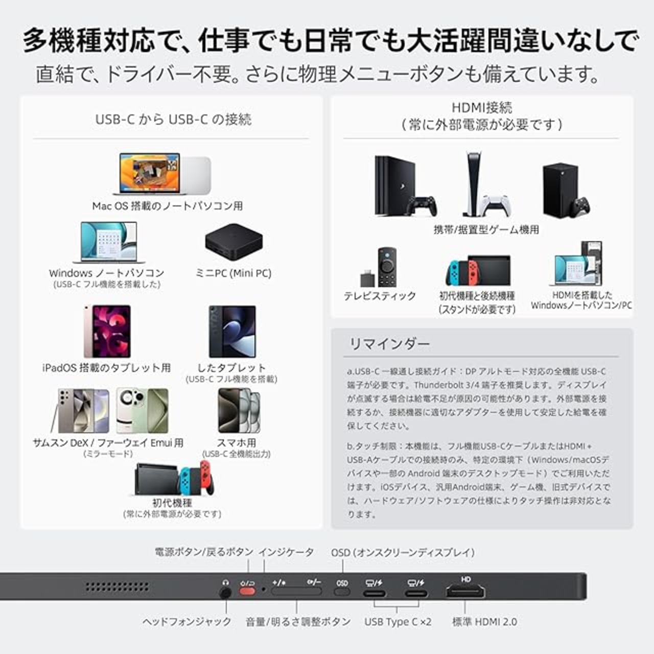 「デュアル USB-C× 標準 HDMI 多機種接続革命」2 ポート の フル機能 USB Type-C(PD20W 給電 + 音画伝送) と 標準 HDMI を搭載し、PC、スマホ、タブレット、ミニ PC、ゲーム機、TV スティックなどあらゆる機器を、ドライバーのインストール不要ですぐに接続。タッチ操作は Windows/macOS/サムスン DEX システムをネイティブサポートする一方、非タッチ機器でも USB-C または HDMI による単体接続で大画面表示を楽しめます。マルチデバイス互換性 × ポータビリティ が融合し、仕事、日常、ゲームシーンで 従来概念を覆すモバイルモニター体験 を提供し、携帯型ディスプレイの可能性を一新します。