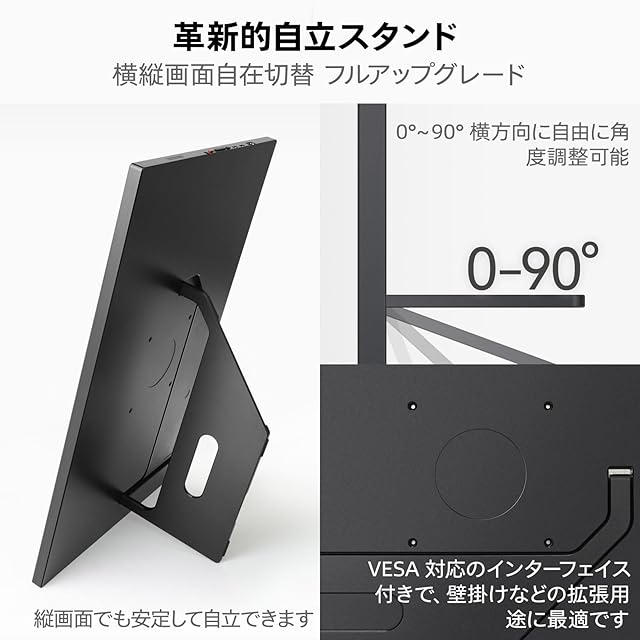 「アルミボディ × 自立スタンドのバランス美学」17.3 インチでも 1.4kgの CNC アルミボディは軽量・高耐久。自立スタンドで角度調整自在ながら、さらに VESA マウント(75×75mm 規格)を搭載。バッグ収納時の持ち運び性と卓上設置、壁掛けやスタンド取り付けまで多様な設置方法を網羅。現場・出張・移動中でもすぐに使える。11mm 薄型設計でバッグ収納もスムーズ,プロが求める「いつでもデスク環境を持ち運ぶ」実用性を実現。