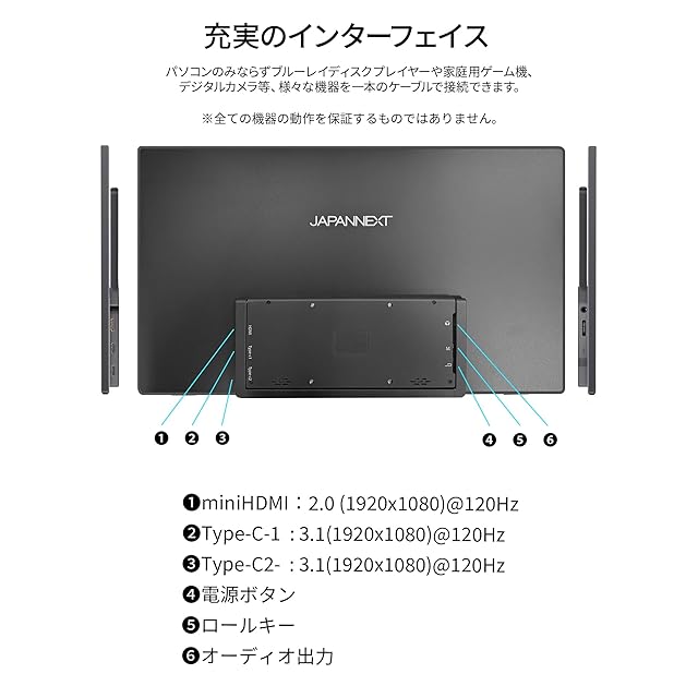 18.5インチ IPSパネル搭載 フルHD(1920x1080)解像度のモバイルゲーミングモニターです。120Hzの高速リフレッシュレートに対応し、FPSなどの動きの早いゲームも場所を選ばずにプレイが可能です。上下左右178度に対応した広視野角IPSパネルを搭載。コンテンツを色鮮やかに映し出します。