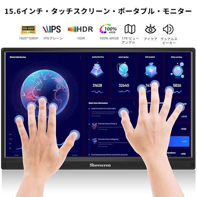商品名:Showscrenモバイルモニター 15.6インチタッチパネル モニター FHD 1920x1080 300cd/ 輝度 IPS液晶パネル モバイルディスプレイSwitch対応 超薄型 HDMI/USB-C/USB 内蔵スピーカー PC PS5 XBOXに対応