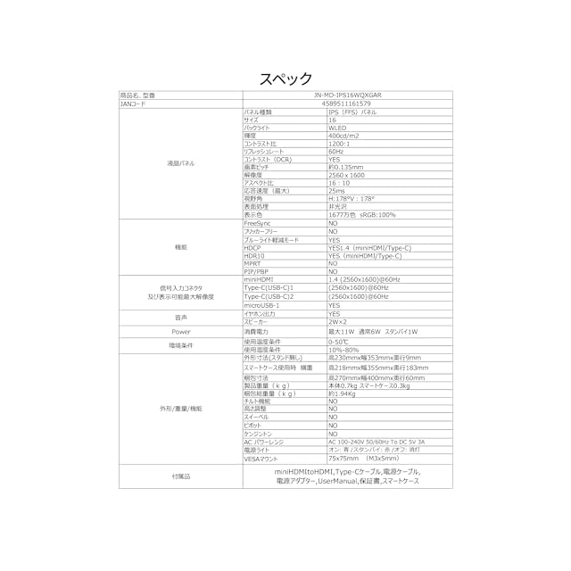 商品名:JAPANNEXT 16インチ モバイルモニター IPS パネル WQXGA 2560x1600解像度 スマートケース付き (USB/Type C/MAC PC対応/スピーカー内蔵 / sRGB100% / 非光沢) JN-MD-IPS16WQXGAR