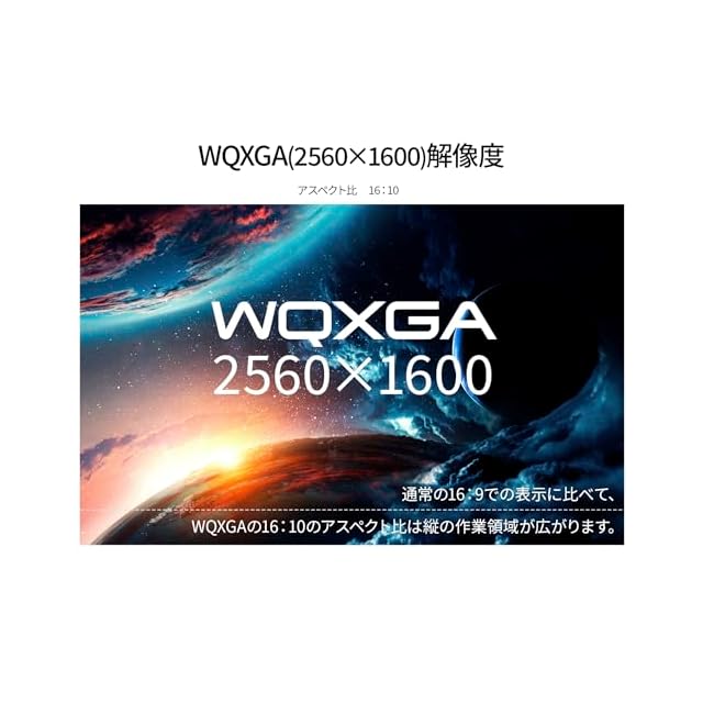 WQXGA(2560x1600)解像度は、フルHD(1920x1080)より+98%も高精細でデスクワーク使用時には画面を広く、また写真や動画視聴の際はさらに美しく表示します。