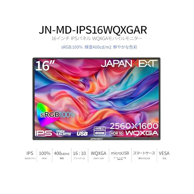 JAPANNEXT 16インチ モバイルモニター IPS パネル WQXGA 2560x1600解像度 スマートケース付き (USB/Type C/MAC PC対応/スピーカー内蔵 / sRGB100% / 非光沢) JN-MD-IPS16WQXGAR
