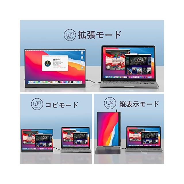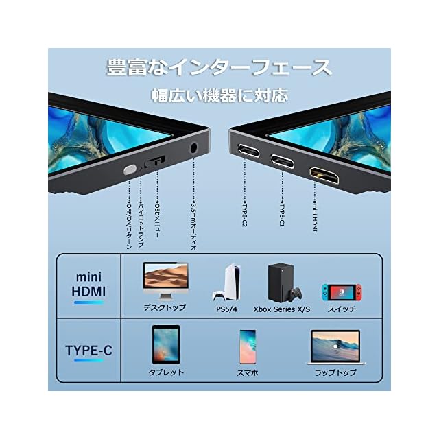 【ケーブル1本映像出力・電源供給】miniHDMI、Type-C二つ、3.5mmイヤホン、豊富な入力端子をもって多様な接続方法を実現。何よりも便利なのは、Type-Cケーブル一本で映像出力と給電を同時に実現できます、しかも二つのType-C端子とも信号転送+給電両対応。Type C端子で接続できない端末は、HDMI接続との選択肢があります。両端子とも対応している端末なら自由に接続できます。(mini HDMI接続の場合は、ディスプレイに給電が必要です)
