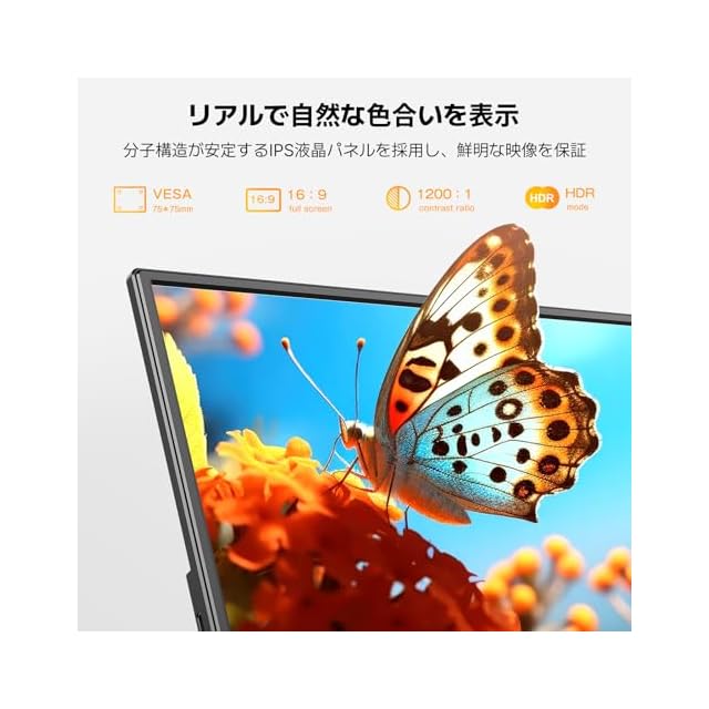 ●スマートな一体型スタンド 外部モニターはスマートな一体型スタンドを搭載している、横置きで0~90°調整可能なスタンドが安定したサポートを提供します。従来のカバー外付けモニターによりも滑りにくい、より安定したオフィス環境を実現します。 ●極薄型・超軽量 0.65Kg軽量と0.8cm薄型の外観が携帯性を展示して超薄型ベゼルにより美観が向上し、表示されるコンテンツの量が増えたため、モバイルオフィスに最適なオフィスツールです。小さい体積が簡単にバッグに収納されるので、狭いワーク環境で保管スペースを省けて生活コストを節約できます。 ●フルHD画質・IPS液晶パネル サブディスプレイの画面解像度は在宅勤務やゲーム、動画視聴に最適な臨場感がある15.6インチ大画面フル HD(1920×1080)です。ポータブルディスプレイはHDR技術搭載しているので、残像のない動画標準が必須であるショートビデオまたはライブションには、また速い動きの映像などの競技ゲームには、ダイナミックな高精細映像が美しい色彩描写を最大限に表示して楽しめます。 ●標準VESA穴・縦横で自由設置 ゲームもにたーは75mmの標準の穴距離、3mmの穴深さで穴開けるため、モニターアームに付けても壁掛けなどでも簡単に好きな場所に任意の視野角で取り付けられます。立ったり座ったり寝転んだり、いつでもどこでも15.6インチの高精細画面の表示による快適な映像体験を楽しめます。 ●複数の接続方式・簡単に設定 セカンドモニターの接続端末には汎用性の高いみにMiniHDMI・USB Type-Cの2種類を搭載します。Mini HDMIにより多いパソコン、ゲーミングデバイスに自由に接続、Type-Cによりスマホ、Macなどの携帯デバイスにも簡単に使用。TypeCケーブルを使う場合には、ケーブルを1本で映像・音声・給電を伝送でき、外付けの電源が必要無し!