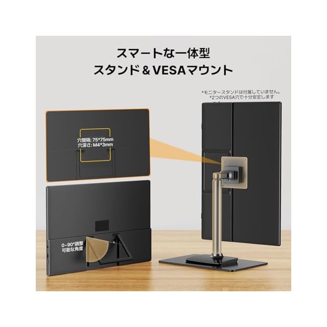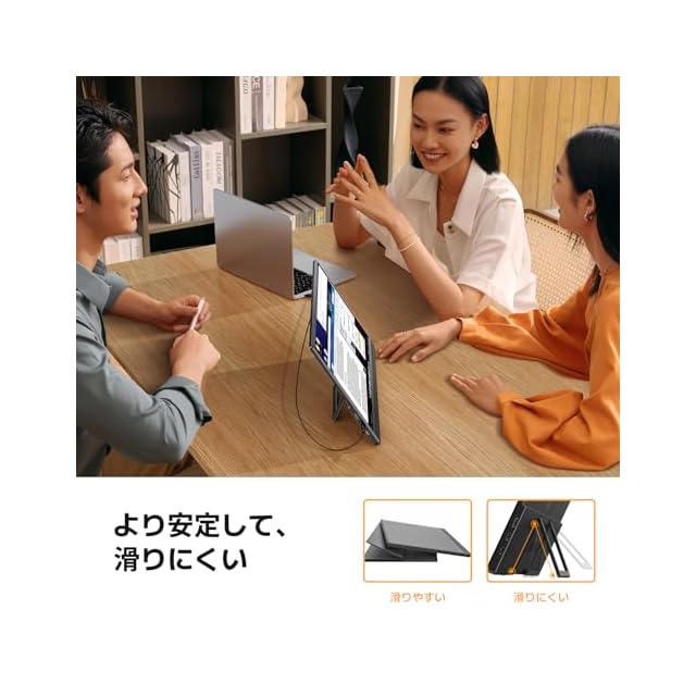 【スマートな一体型スタンド】 外部モニターはスマートな一体型スタンドを搭載している、横置きで0~90°調整可能なスタンドが安定したサポートを提供します。従来のカバー外付けモニターによりも滑りにくい、より安定したオフィス環境を実現します。画面コンテンツを仕事仲間と共有することで、仕事の効率を大幅に向上できます。