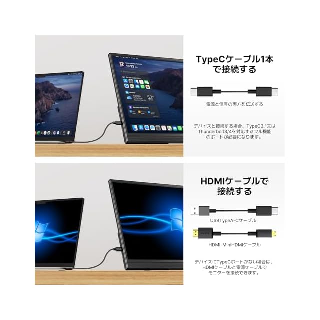 【複数の接続方式・簡単に設定】 セカンドモニターの接続端末には汎用性の高いみにMiniHDMI・USB Type-Cの2種類を搭載します。Mini HDMIにより多いパソコン、ゲーミングデバイスに自由に接続、Type-Cによりスマホ、Macなどの携帯デバイスにも簡単に使用。TypeCケーブルを使う場合には、ケーブルを1本で映像・音声・給電を伝送でき、外付けの電源が必要無し!ミーティングの場合に薄型モニターとケーブル1本だけ持ち込めば、ノートPCやスマホの書類やプレゼン資料を大きな画面で共有されます。モバイルpcモニターのインターフェイスが豊富なので、新しいデバイスなら問題なく対応でき、時間のコストを節約、作業効率をダブルに!注意:デバイスに接続するには、Type-C3.1又はThunderbolt3/4のフル機能のポートをサポートするのが必須です。