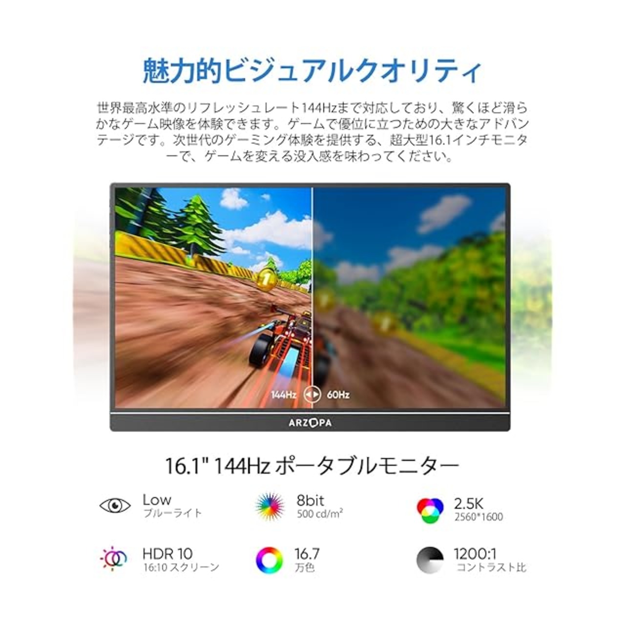 ARZOPAモバイルモニター 144Hz 16.1ゲームモニター FHD IPS液晶パネル 72%色域 非光沢 軽量ディスプレイ 標準HD/USB/Type-C/mini HDMI端子 PS4/PS5/XBOX/Switch/PC/Macなど対応 PSE認証済み 自立型