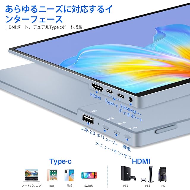 【幅広い互換性】このラップトップポータブルディスプレイは、2つのUSB Type-Cポートと1つのHDMIポートを備えており、USB Type-CまたはHDMIケーブル1本でほとんどのデバイスを簡単に接続できます。 ノートパソコン、PC、スマートフォン、XBOX、SWITCH、PS4、5など、HDMIまたはUSB Type-Cデータポートを搭載したすべてのデバイスに対応します。