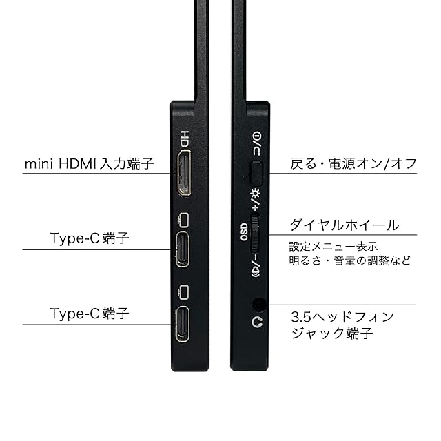 インターフェース:HDMI/miniHDMIケーブル、Type-C/Type-Cケーブル、Type-C/Type-Aケーブルが付属。イヤホンジャック付。