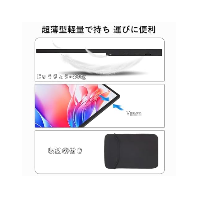 【3-in-1モードモニター】タッチスクリーンモニターは、複製モード、拡張モード、セカンドスクリーンモードをサポートしており、作業、ゲーム、ビデオ鑑賞などのニーズに応えます。 スタンド付きなので、0°から45°まで自由に調整できます! 十分なホールド力で、広い角度でも倒れる心配はありません!VESA穴は2つもあり、VESAアームに揺れなく取り付けられます。15.6インチのタッチスクリーンモニターはスリムで軽量、収納袋をつけます,ホコリや傷を防ぎます,携帯に便利です!