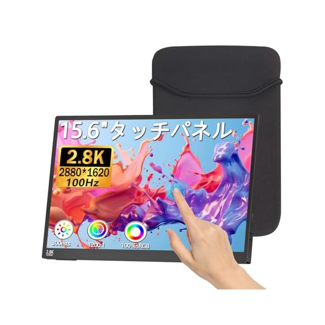 商品名:モバイルモニター タッチパネル 15.6インチ 2.8K モバイルディスプレイ 100Hz 薄型 軽量 16:9画面比 2880x1620 ポータブルモニター 100%sRGB広色域 300nits 高輝度 内蔵スピーカー Type-C/mini HDMI PS4/PS5/PC/Macなど対応