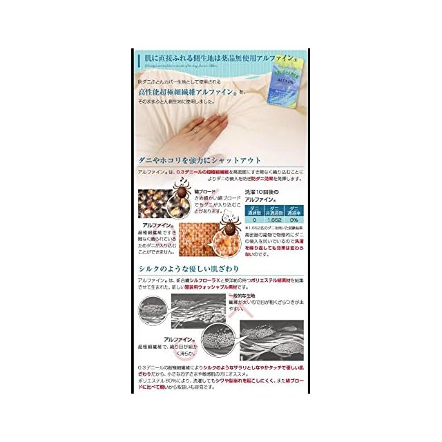 ・高密度で織られているのでダニの進入を防ぎます。ダニの通過率0%! ・薬品を使用していないので人体に無害で優しい素材です ・超極細繊維で織られているのでシワや型崩れになりにくく、繰り返しのお洗濯にも強く大変丈夫な生地です