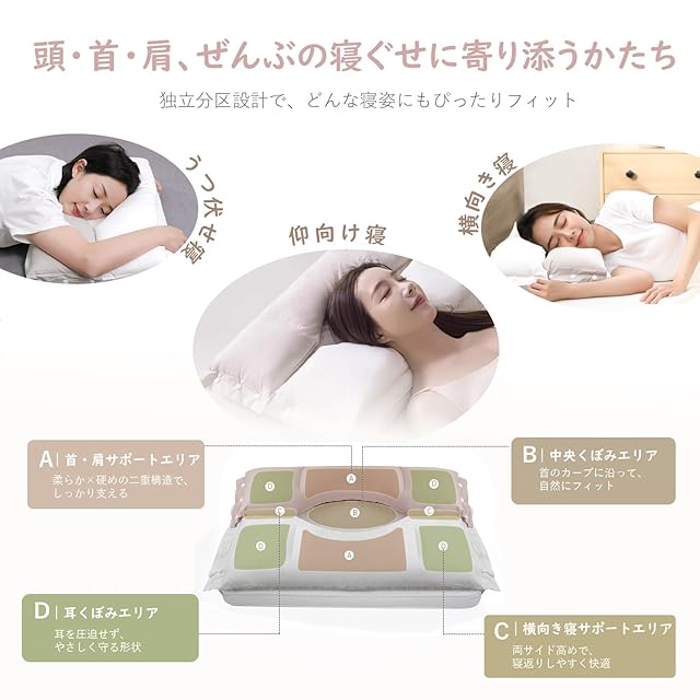 【分区設計で、寝返りしてもぴったりフィット】-- 独立した分区設計により、各部位の異なるニーズに対応。耳部分には圧力を避けるための凹みを設け、横向き寝でも不快感を感じさせません。肩と首部分はしっかりとサポートし、寝返りを打っても枕の位置を調整する必要がありません。枕が姿勢の変化に自然にフィットし、夜通し快適に支え続けます。毎晩の眠りが、ふわっと心ほどける時間に。