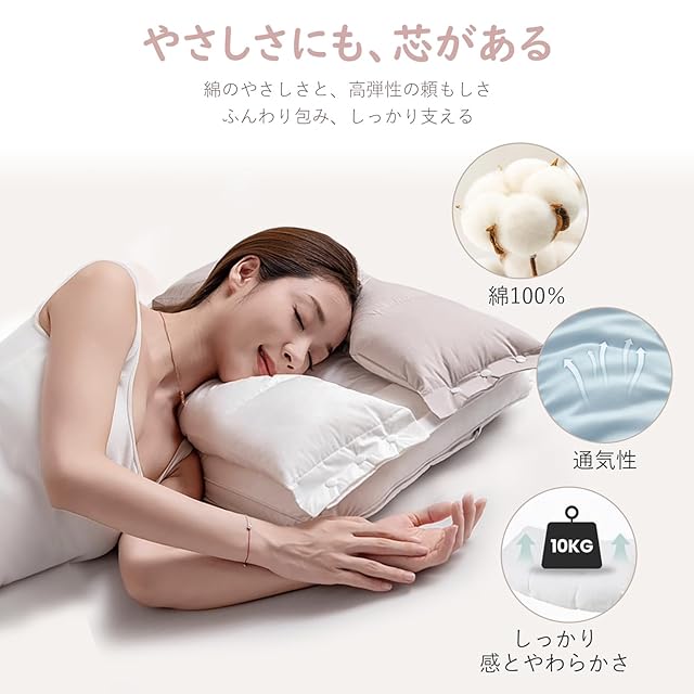 この枕の頸椎サポート設計は、自然な生理曲線にぴったりとフィットし、頭・首・肩が一晩中スムーズで自然な姿勢を保ちます。頸椎を巧みに支え、浮きや前傾を防ぎ、寝る瞬間から体はリラックスした姿勢に入り、まるで心地よく導かれるように深い眠りへ。<br><br> 枕の外側は純綿のやさしい生地で、肌触りはまるで柔らかな布に包まれるよう。内側には高弾性繊維を使い、ふんわりとしたやわらかさと、しっかりとした支えが心地よく調和しています。枕に頭を預けると、首や肩がやさしく支えられ、長時間使用しても快適な姿勢が保たれます。寝返りを打っても安定感があり、目覚めもスッキリ。深い眠りへと導いてくれる理想的なサポート枕です。<br><br> うちの枕は、6cmまたは10cmの高さに合わせて調整でき、どんな寝姿にも自然にフィットします。上層は取り外しができ、抱き枕やクッションとしても使えるので、使い方も自由。下層は仰向けにぴったり、二重にすれば横向きやうつ伏せにも心地よく包み込みます。どんな寝姿でも、ふんわりと心地よいフィット感が広がります。<br><br> 独立した分区設計により、各部位の異なるニーズに対応。耳部分には圧力を避けるための凹みを設け、横向き寝でも不快感を感じさせません。肩と首部分はしっかりとサポートし、寝返りを打っても枕の位置を調整する必要がありません。枕が姿勢の変化に自然にフィットし、夜通し快適に支え続けます。毎晩の眠りが、ふわっと心ほどける時間に。<br><br> まくらの快適さは、実際に使ってみることで最も実感できます。私たちは、お客様の睡眠習慣に合わせて、30日間の試用期間を提供しています。この期間中に枕の高さや使用感を自由に調整し、最適な使い方を見つけていただけます。万が一、試用期間内にご満足いただけない場合は、返品も可能です。私たちの約束は、細部にまでこだわり抜いたまくらの品質に自信があるからこそ、提供できるものです。
