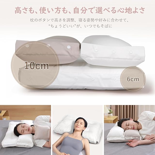 【高さを調整して、リラックスした寝姿を整える】--うちの枕は、6cmまたは10cmの高さに合わせて調整でき、どんな寝姿にも自然にフィットします。上層は取り外しができ、抱き枕やクッションとしても使えるので、使い方も自由。下層は仰向けにぴったり、二重にすれば横向きやうつ伏せにも心地よく包み込みます。どんな寝姿でも、ふんわりと心地よいフィット感が広がります。