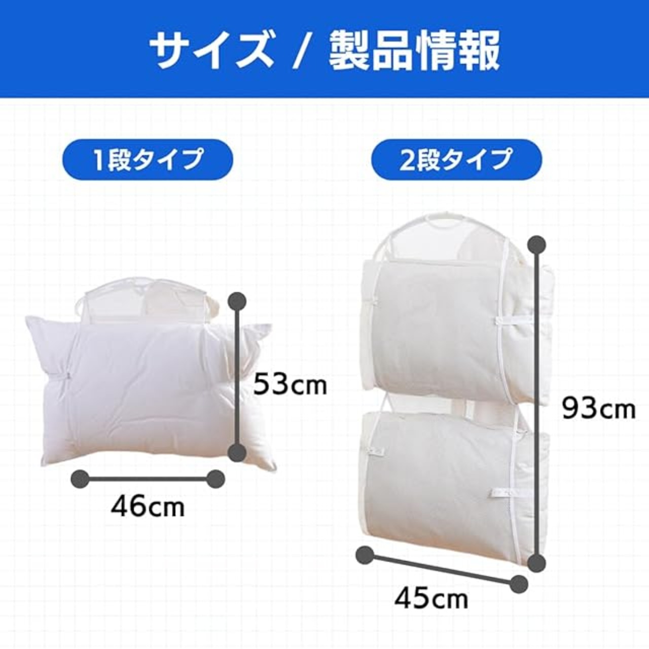 【簡単に干せる枕干しネット】枕やクッションを効率的に干せる便利なアイテムです。乾燥後も変形せず、長期間安心して使用できます。【風で落下しない】落下防止用のストラップは干している物のサイズに合わせて調節可能。しっかりと固定できるため安心です。【使いやすい】干している物の出し入れは両側から行えるため、場所や状況に左右されずスムーズに干すことができます。【さわやかに保つ通気メッシュ】メッシュ素材で通気性と乾燥性に優れ、風通しが良いため枕やクッションを衛生的に保ちます。【サイズ】・1段タイプ 縦=53cm×横=46cm ・2段タイプ 縦=93cm×横=45cm 「バリエーション」・1段タイプ・2段タイプ
