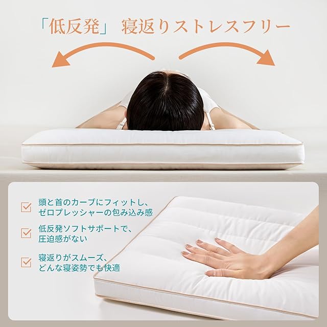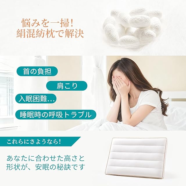 【低反発安眠枕】上層部に100%マユシルクを使用することで柔らかな肌触りを実現し、下層部のポリエステルファイバーが安定したサポートを提供します。適度な硬さで沈み込みすぎず、肩楽寝をサポートするため、長時間使用しても形状が崩れにくく、常に最適な睡眠の快適さを維持します。