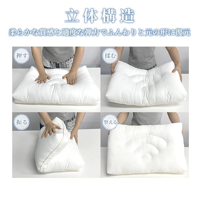 【立体構造】側面には型崩れを防ぐマチ加工を採用。ふんわりとした柔らかさと適度な弾力性を備えた立体構造により、首や肩の負担を軽減する適度な硬さが両立しているため、 寝返りを打っても快適な姿勢を保てるのです!仰向け寝・横向き寝・うつ伏せ寝、お好きな寝姿でぐっすり眠れます。