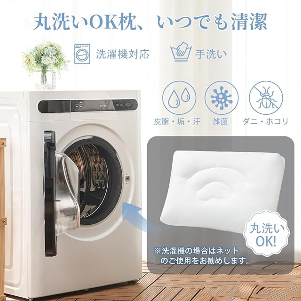 【丸洗い可能】 この枕は、家庭用洗濯機で簡単に洗うことができ、いつでも清潔に保てます。洗濯の際には、必ず洗濯ネットをご使用ください。手間をかけずに清潔を維持できるので、忙しい毎日を送る方にも最適です。アレルギー体質の方にも安心してご使用いただけます。常に清潔な状態を保つことで、快適な睡眠環境を提供します。
