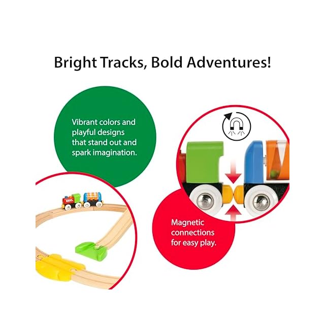 【車両は振ると音が鳴ってガラガラに】N・S極の区別がなくどちら向きでも連結可能なマグネット内蔵の車両は、小さなお子様でも楽しく遊ぶことができます。付属のガイドレールで簡単にレールの上に列車を乗せられ、ガタゴト橋と坂レールで坂遊びもでき、ブリオの他の情景部品や追加パーツとの互換性もあります。