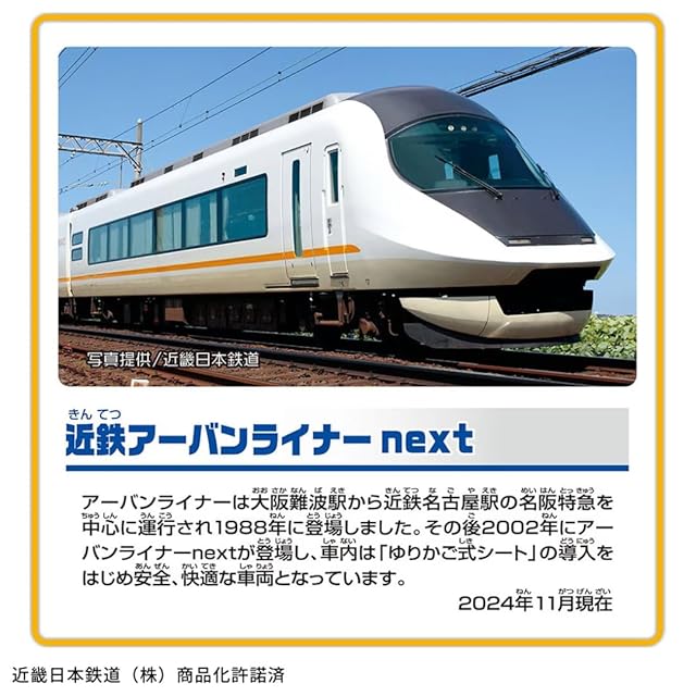 アーバンライナーは大阪難波駅から近鉄名古屋駅の名阪特急を中心に運行され1988年に登場しました。 その後2002年にアーバンライナーnextが登場し、車内は「ゆりかご式シート」の導入をはじめ安全、快適な車両となっています。 ■「アーバンライナーnext」がモデル ■3両編成でそれぞれ連結・切り離し可能 ■2スピードで電動走行、スイッチOFFで手転がし遊びが可能 ■プラ列車カード付 ※レールは付属しません。