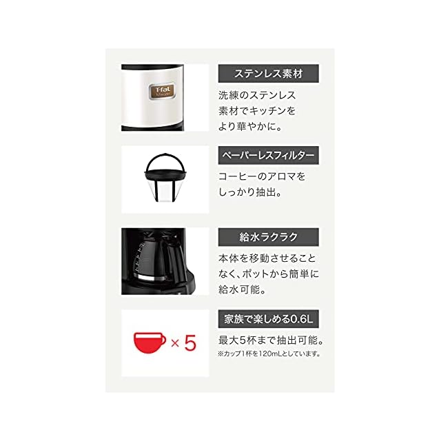 ティファール コーヒーメーカー 0.6L/5杯用 選べる2つのモード ペーパーレスフィルター ドリップ式 「コーヒーメーカー メゾン スノーホワイト」 CM4901JP